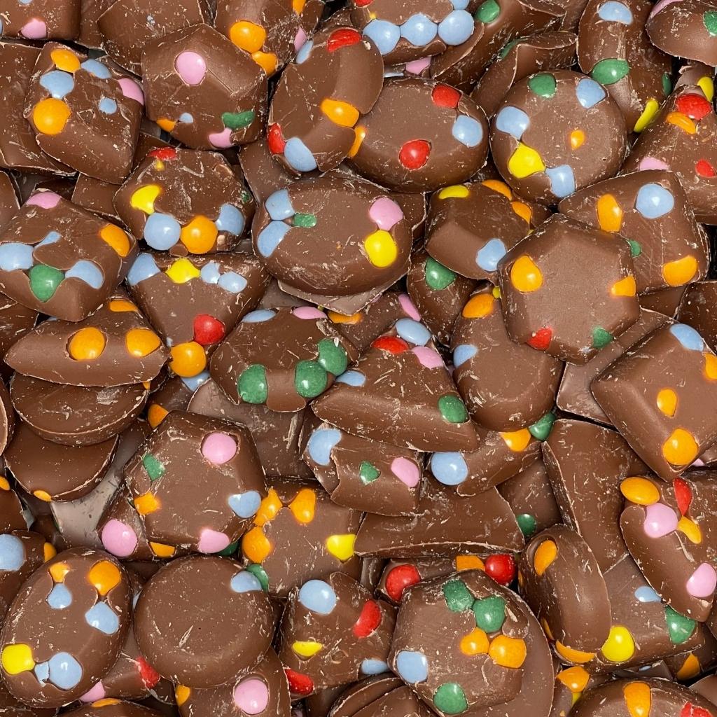 Creamy milk chocolate with crunchy candy-coated chocolate pieces combined into fun colorful shapes.