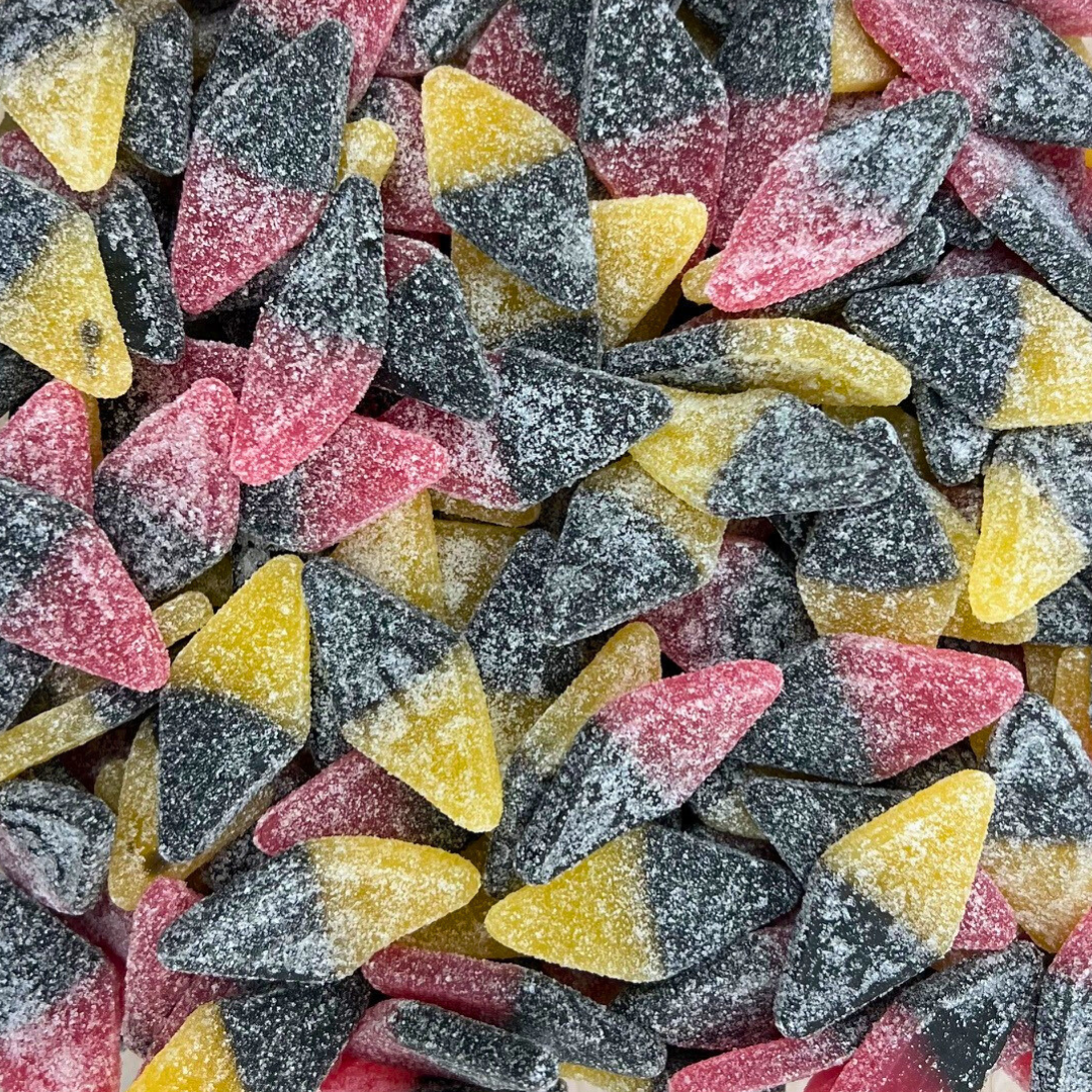 New! A bold mix of sweet fruit gummies and salty licorice all in one colorful bite. These soft triangles come in juicy berry and citrus flavors paired with classic Finnish salmiak for the perfect sweet and salty balance.