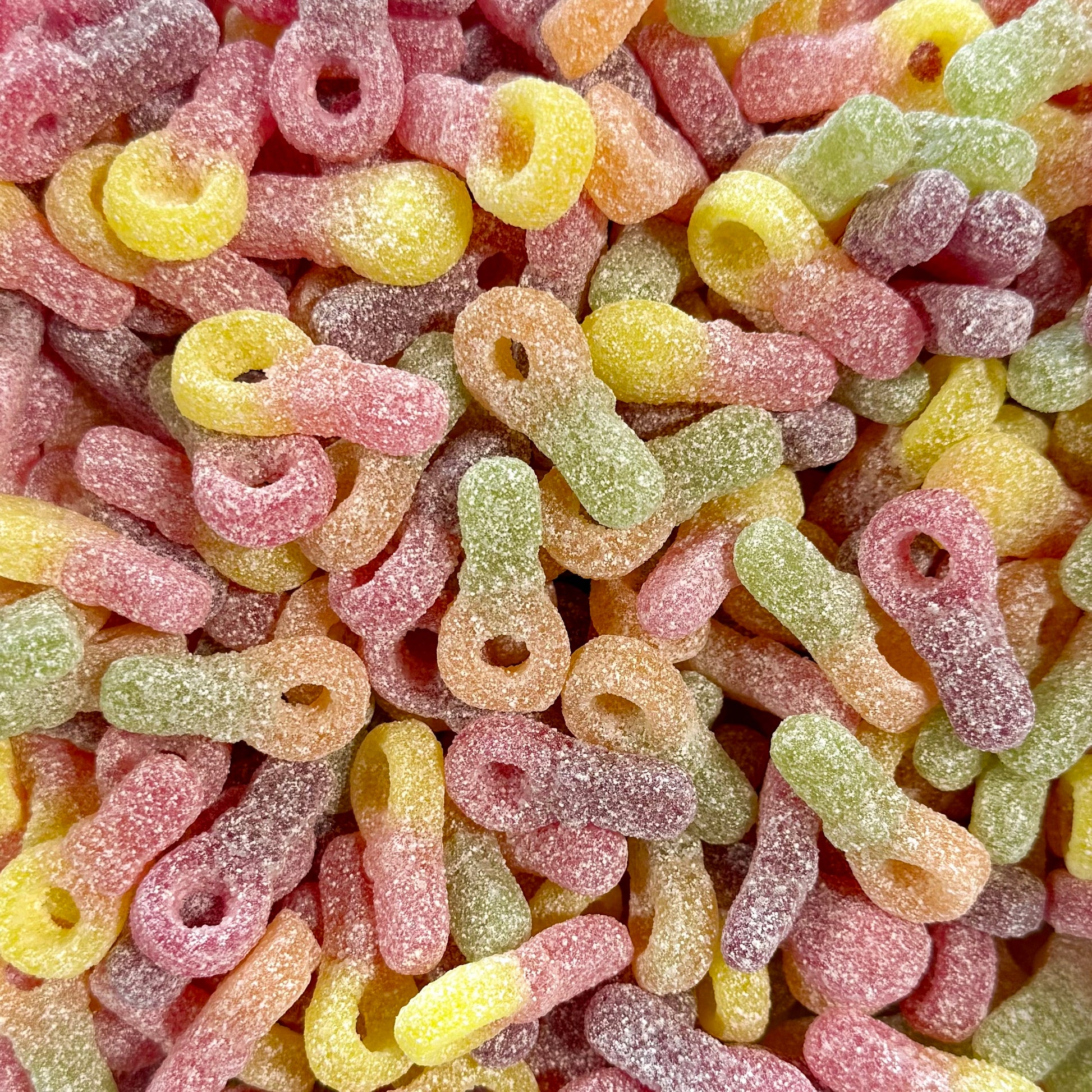 New Sour Mini Fruity Pacifiers. These colorful cuties are tiny, tangy, and totally addicting. Each sour gummy comes in a playful pacifier shape and features a two-tone, double-flavor combo for a fun and fruity bite every time. They’re sweet, sour, and impossible to eat just one. Gelatin Free and Vegan.