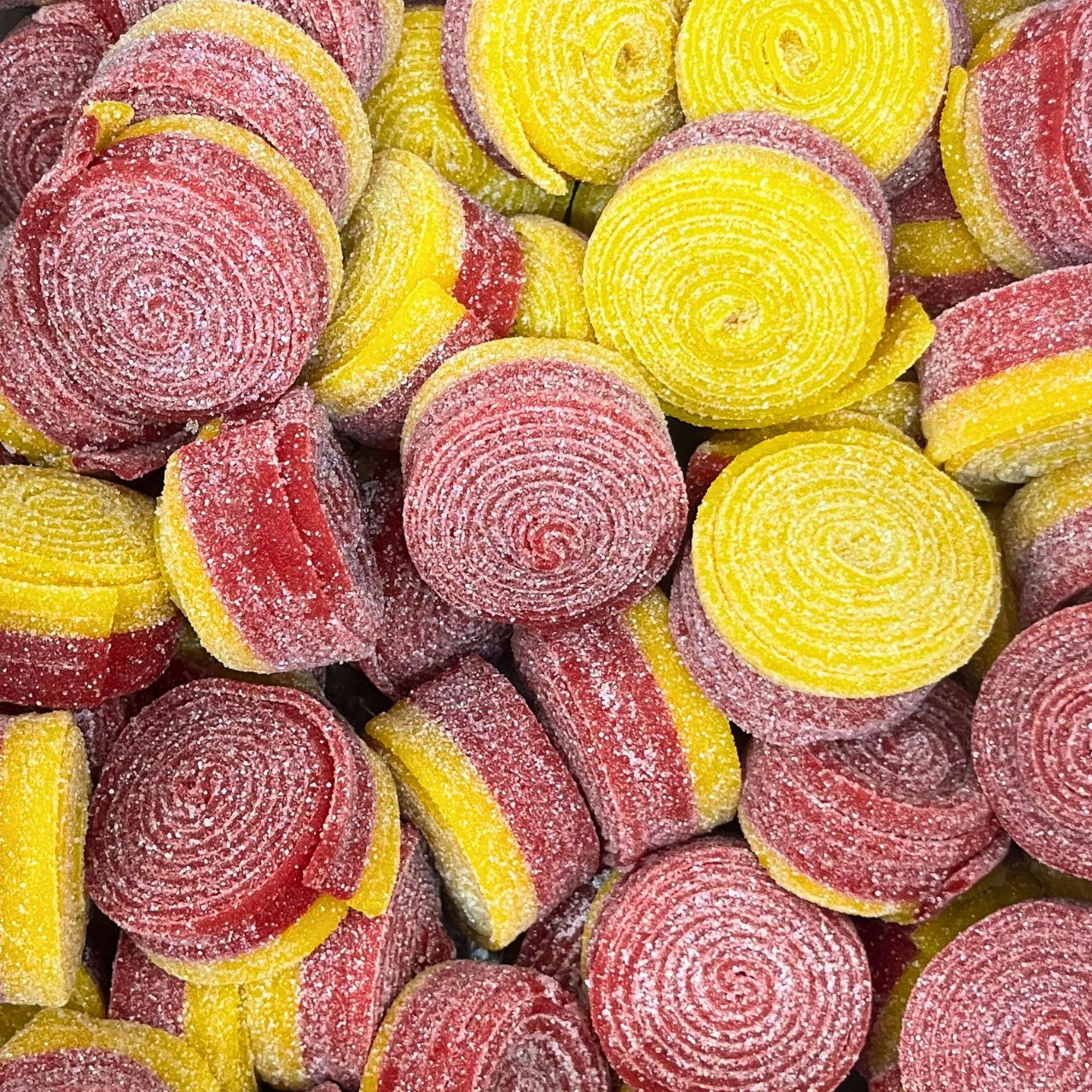 Sweet, sour, and totally addicting. These strawberry and lemon belt rolls are coated in tangy sugar crystals for the perfect balance of fruity and fizzy. Each roll unravels into a colorful belt bursting with flavor. A playful twist on a classic sour candy.